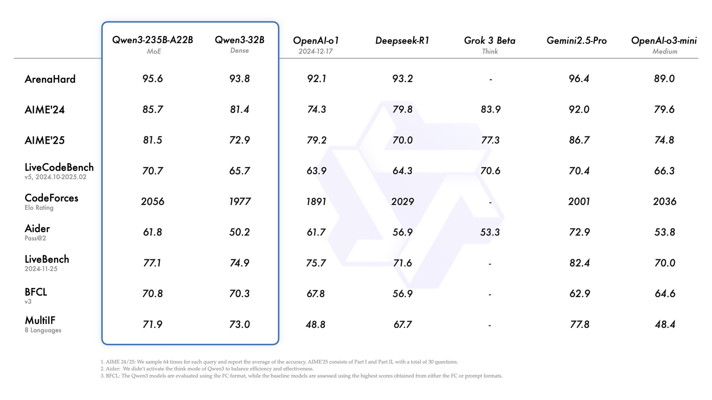 尤其是Qwen3-235B-A22B,做到了开源模型性能新高,各项得分比O1和R1都高。