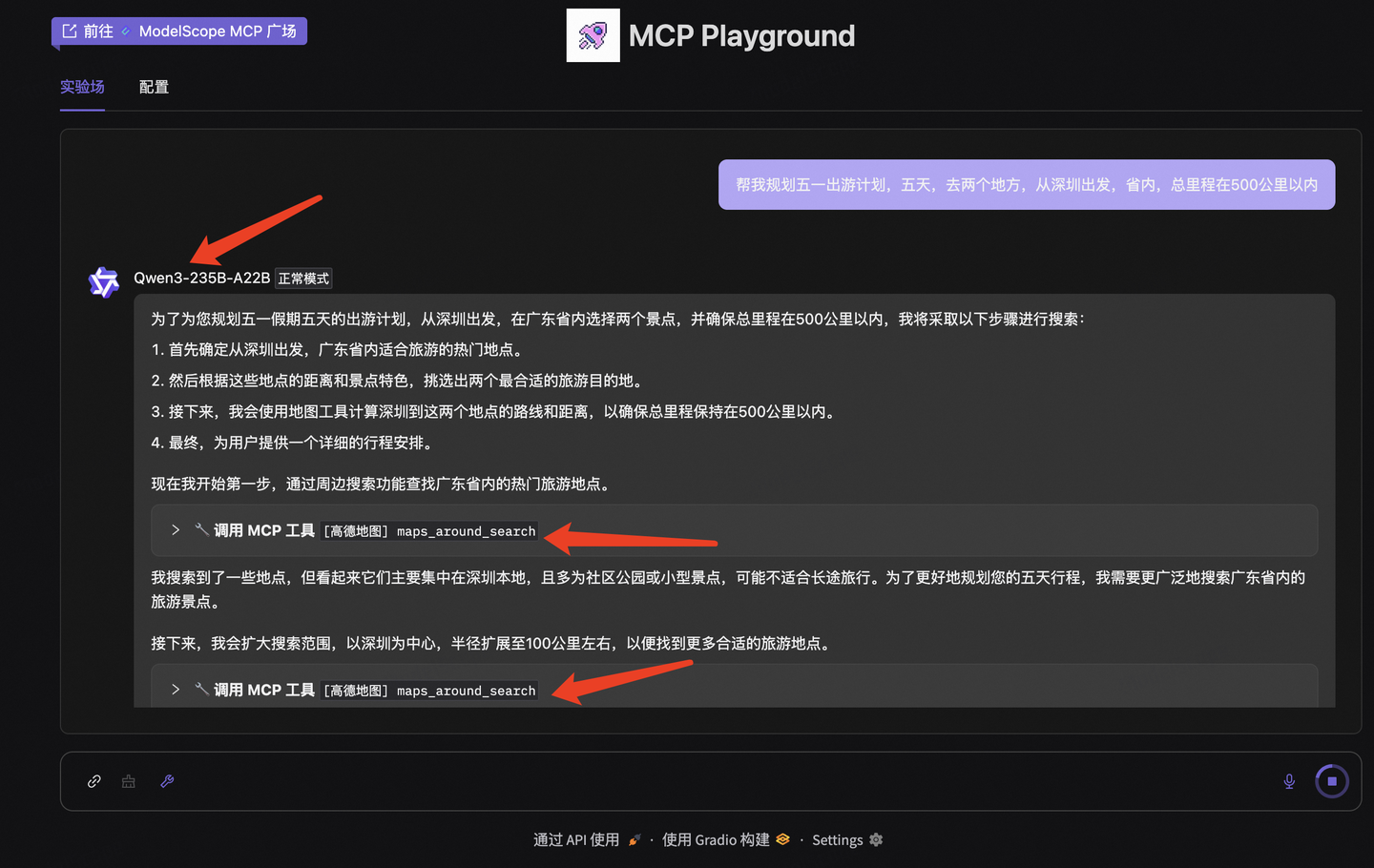 MCP方面,Qwen3也是原生支持的。懒得自己本地部署的,可以去ModelScope的MCP广场试一下,我试了下,目前已经可以调用Qwen3-235B-A22B了。