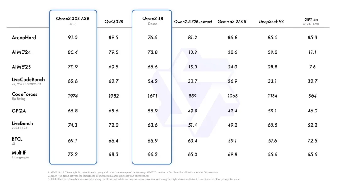 根据技术报告,Qwen3系列的性能还是强劲的,在数学、代码、推理等方面全面提升,直接登顶了全球最强开源模型。根据他们谦虚的说法是,在各同尺寸开源模型里面,它都做到了SOTA。但实际上,面对很多比其尺寸大的模型,其性能也是不输的。例如Qwen3-30B-A3B,比GPT-4o,还有自家参数更大的Qwen2.5-72B-Instruct都强不少。