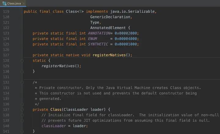 Java有一个Class类,那么按理说我们应该可以new一个Class对象。但Class类是个狠角色,它不仅对自己进行了阉割(final class,不允许继承),还隐藏了构造器(final constructor,不允许new)。也就是说,正常途径下没有人能创建Class对象,也不会有Class的子类。