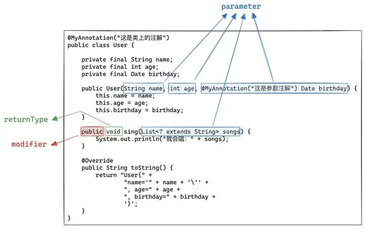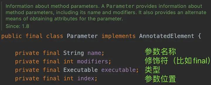 如果你足够耐心,还可以继续细化,比如Parameter可以进一步细分为:修饰符、参数类型、参数名、参数索引(第几个参数)。由于Java已经替我们做好抽象,这里就不再继续重复劳动了。