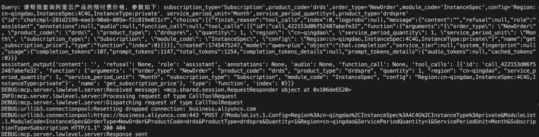在 MCP 架构下,完成一次完整的价格查询流程需要经历多个 Query 阶段,每一次调用都需要基于上一次查询结果提供新的参数。这种链式多轮调用符合 MCP 客户端-服务端协议的典型模式[1]。