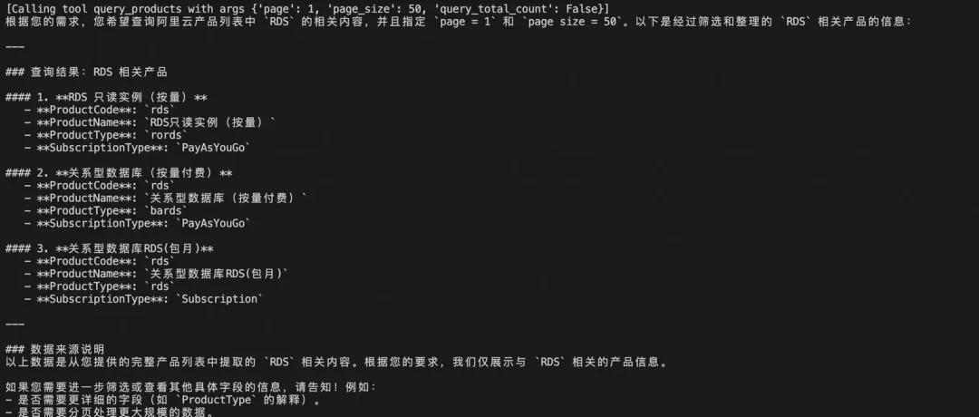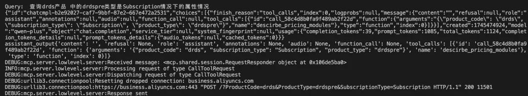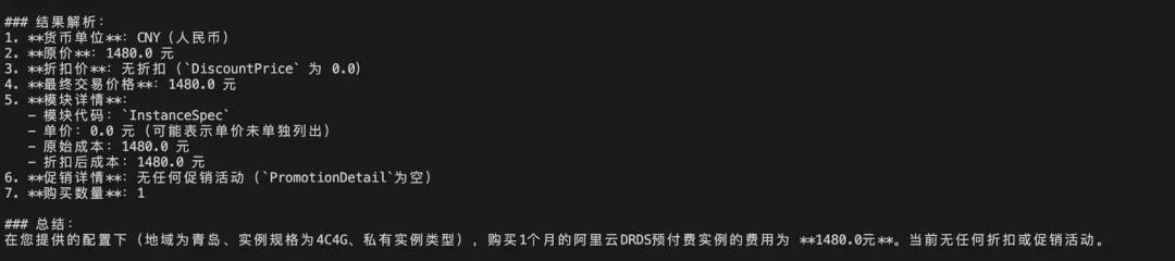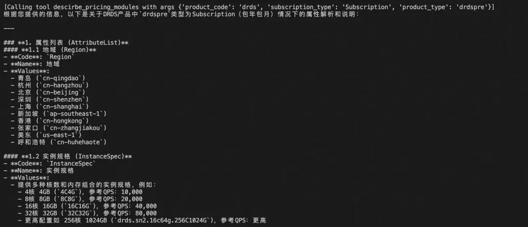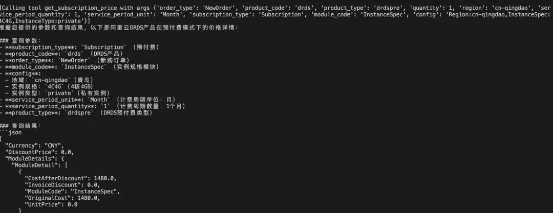 return f"调用失败:{str(e)}"Tips:在工具注册过程中,可参考阿里云官方 OpenAPI 文档(如 DescribePricingModule 接口),结合官方提供的 Python SDK 示例,快速改写成符合 MCP 工具注册要求的标准接口。整体改写过程较为简单,适合快速上手。