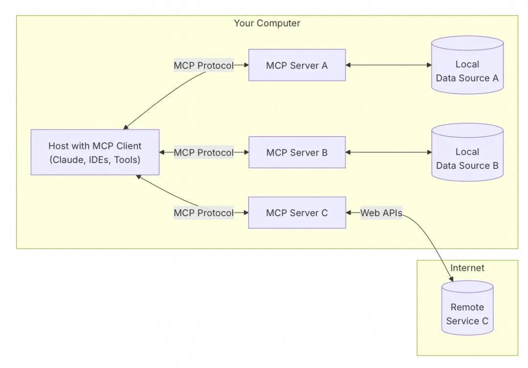 要搭建一个符合 MCP 协议的基本系统,仅需部署一个轻量 Server 并在 Client 端配置相应连接,即可完成工具链接入。MCP 支持包括本地文件、数据库、远程 API 等多种数据源,使系统具备极高的扩展性和可维护性。