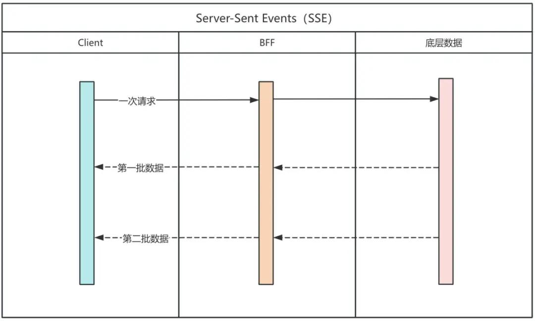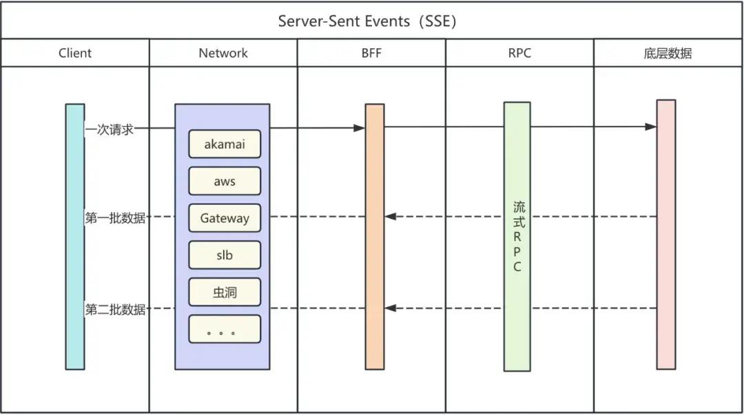 客户端发送一次 SSE 请求,服务端实时推送数据到客户端,服务间上下游同样采用流式传输,实现客户端到服务端全链路流式通信。