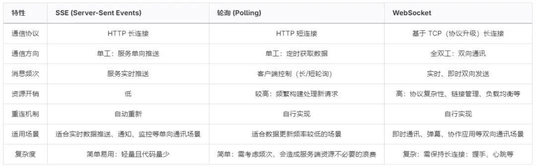 目前市面上很多服务端推送的技术解决方案:SSE、轮询/串行、Websocket 等,我们从易用性,资源开销,使用场景等多维度对比了几个使用较多的主流方案,最终选择了 SSE。