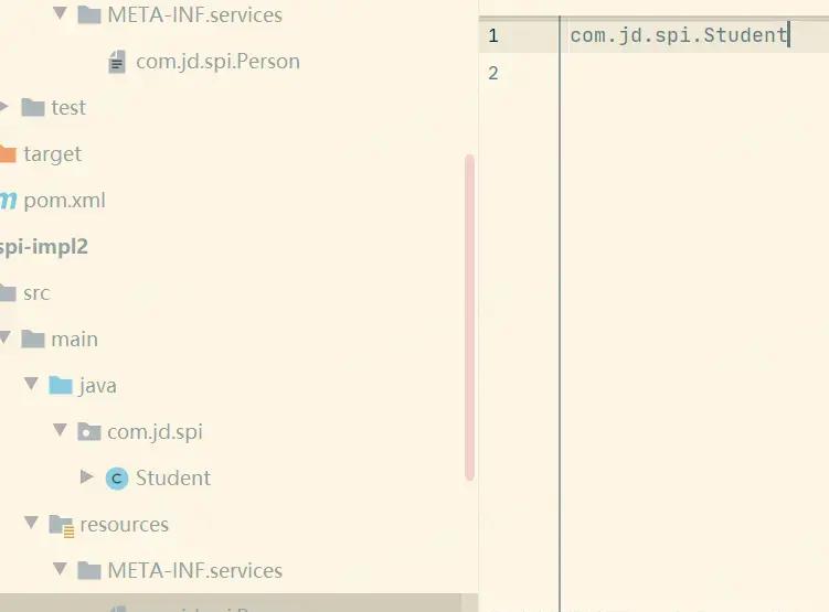 }如下图所示,在项目的resources文件夹下创建两个文件夹META-INF/services,然后在文件夹下面创建名称为com.jd.spi.Person的文件,其文件的内容为当前项目的接口实现类com.jd.spi.Student。
