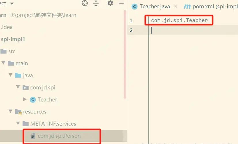 }如下图所示,在项目的resources文件夹下创建两个文件夹META-INF/services,然后在文件夹下面创建名称为com.jd.spi.Person的文件,其文件的内容为当前项目的接口实现类com.jd.spi.Teacher。