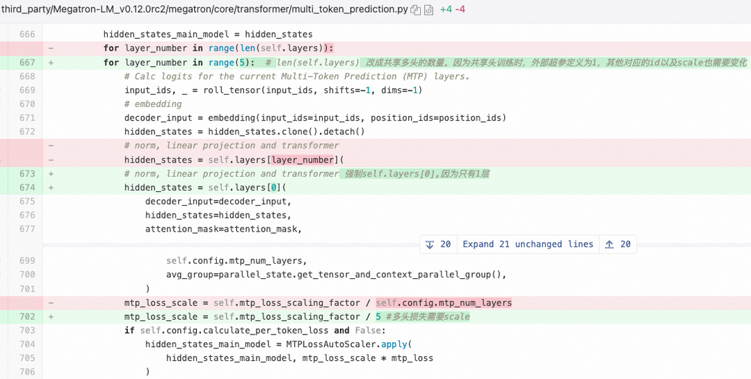 我们使用Megatron-LLM训练MTP层,共享MTP层训练代码修改如下: