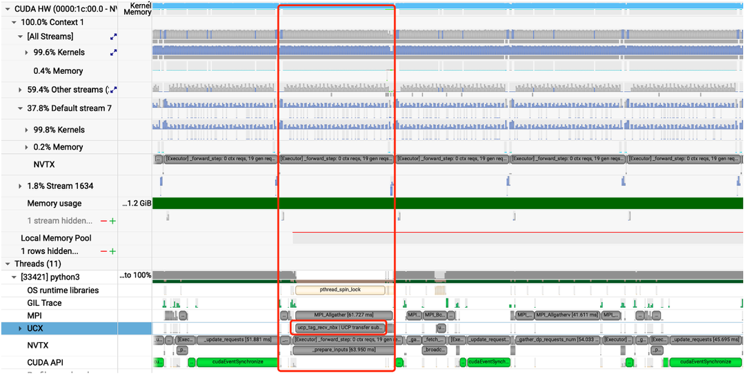 采用上述方法后,可以看到在整个timeline上,计算与传输能够完美overlap,GPU利用率持续保持高位。