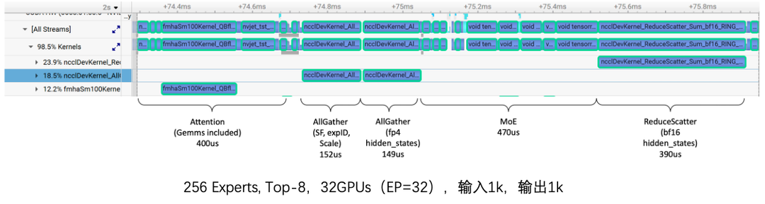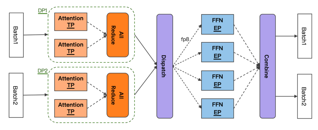 ● 由于存在算力瓶颈,主要采用大TP + 小EP并行策略,提升计算速率