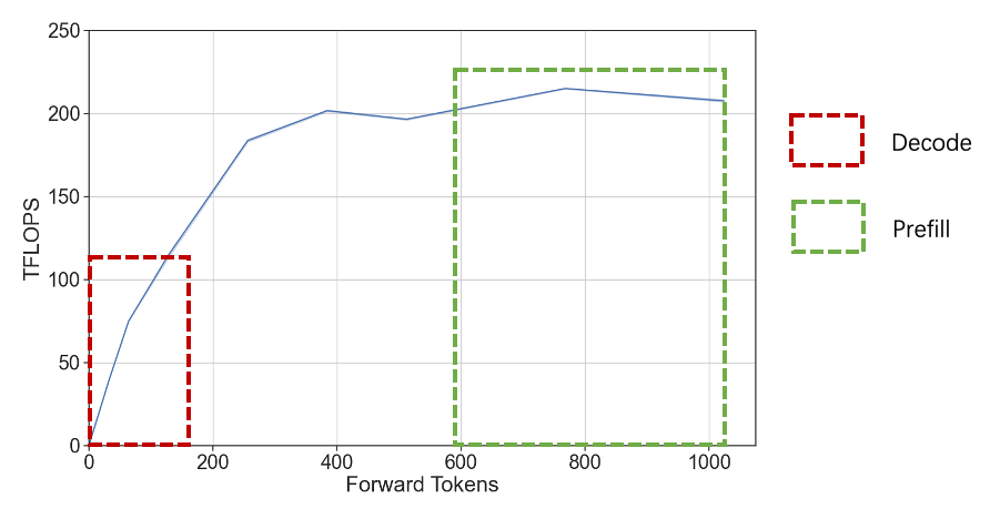 由于prefill阶段和decode阶段任务特点存在一定差异,主要表现在prefill属于compute bound型任务,而decode则属于memory bound型任务,如下图所示,因此我们根据实际情况选用不同的并行策略。