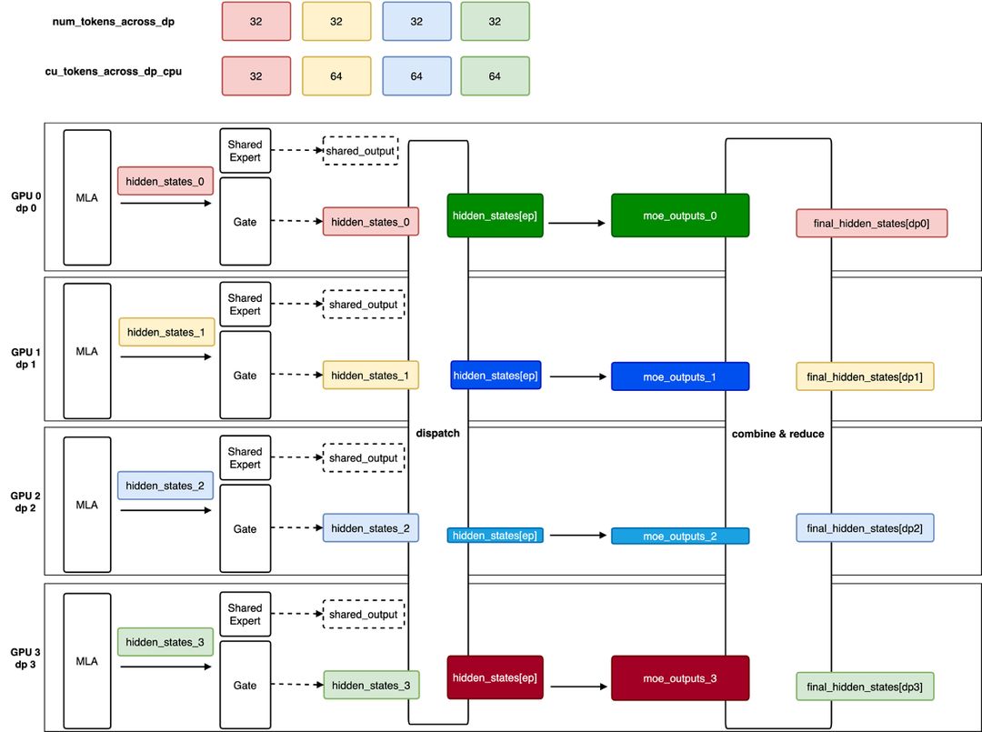● 每个dp rank在每一次forward step至少包含一条请求