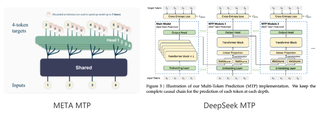 Multi-Token Prediction (MTP)是一种通过对每一个位置预测多个token来改进大模型训练性能的技术,同时MTP也可以用于推理加速。 MTP由META首次提出,DeepSeek在META论文基础上做了进一步改进。