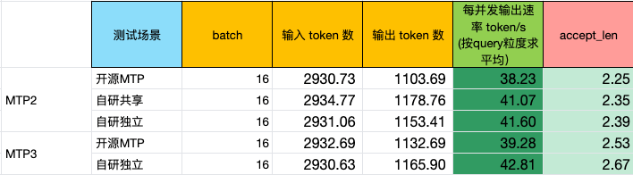 按每并发输出token速率计算,自研两层MTP(MTP2)和三层MTP(MTP3)加速结果如下: