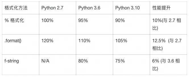 print(message) # print变为函数Python 3.6引入的f-string彻底革命了字符串格式化,根据官方性能测试,f-string在多数场景中比传统格式化方法快20-30%: