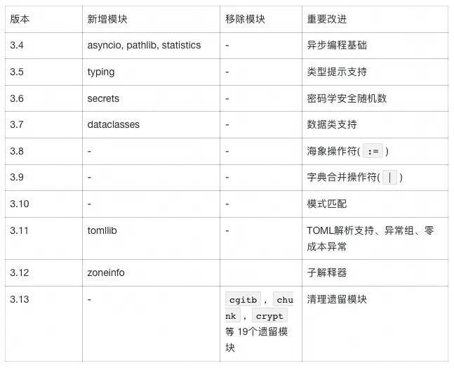 Python标准库的演进体现了从"已包含"到"精选"的战略转变。根据PEP 594的统计,Python 3.13移除了19个过时的标准库模块,这一变化体现了Python社区对代码质量和维护性的重视。