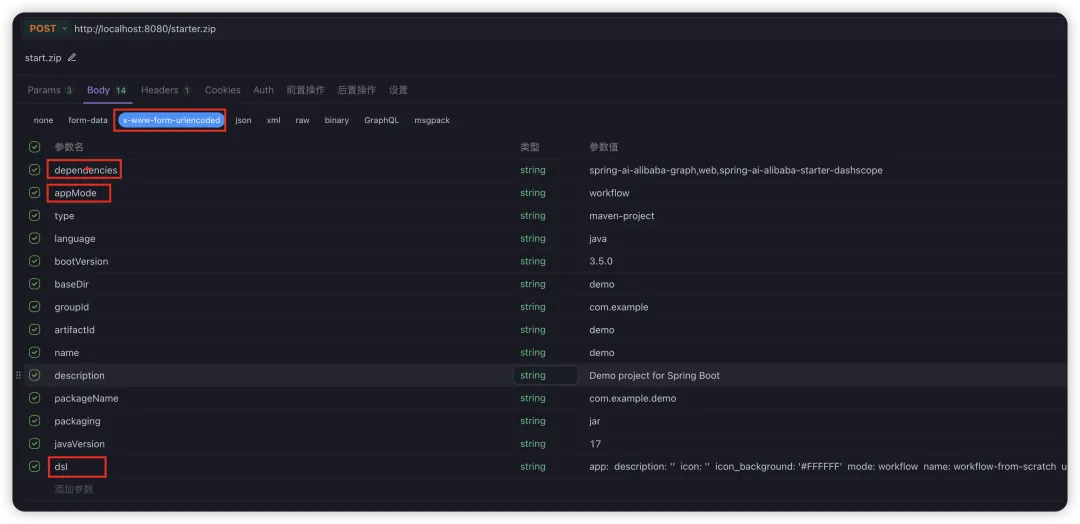 mvn spring-boot:run使用 postman 等工具调用刚刚启动的 Spring AI Alibaba Studio 服务,传入 DSL 文件内容并生成完整的 Spring AI Alibaba 工程。