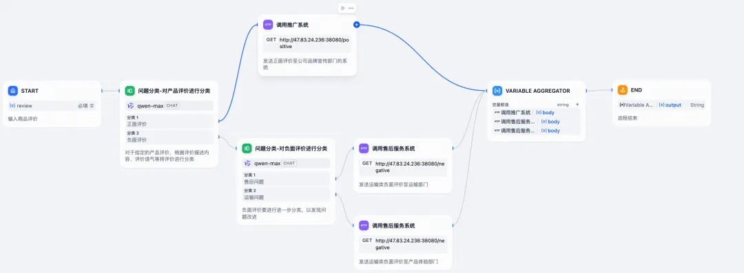 以下是使用 Dify 平台绘制的商品评价分类示例系统的流程图: