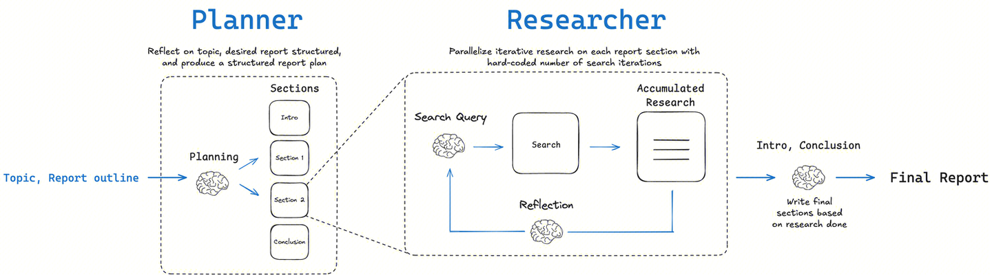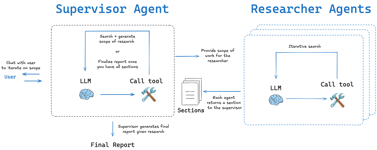 langchain-ai/open_deep_research 项目(包括 LangChain 和 Together AI 的版本)的架构核心是一个多阶段、迭代和自反思(self-reflection)的智能体工作流,旨在模拟人类进行深度研究的过程。这个架构比简单的“提问-回答”模式要复杂得多,其设计目标是处理需要多步推理和信息整合的复杂主题。
