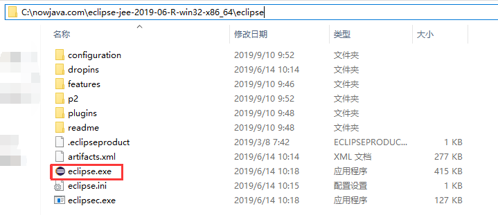 进入Eclipse解压目录,如果我的解压目录是:C:\nowjava.com\eclipse-jee-2019-06-R-win32-x86_64\eclipse,如下图