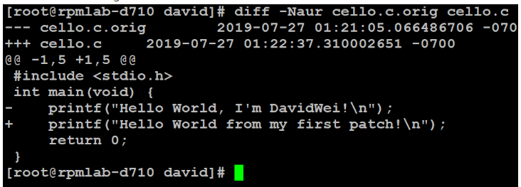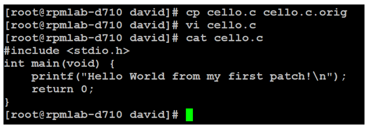 创建补丁的第一步是备份原始源代码,通常是将它拷贝为.orig 文件。我们以 cello.c 为例。