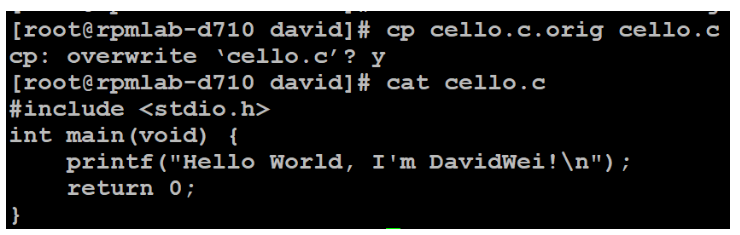# cat bello #!/bin/bash printf "Hello World, I'm DavidWei!\n"