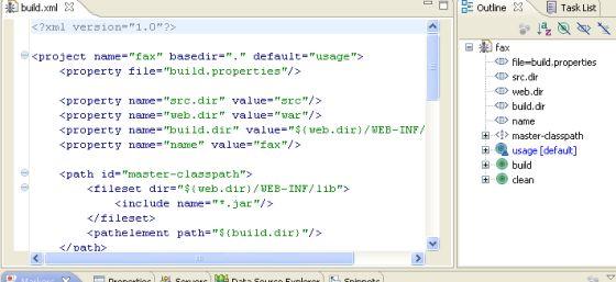 Ant 的 Eclipse 插件还附带了一个很好的编辑器,其可用来编辑 build.xml 文件。该编辑器可以识别 build.xml 模式,并可以协助你完成代码。