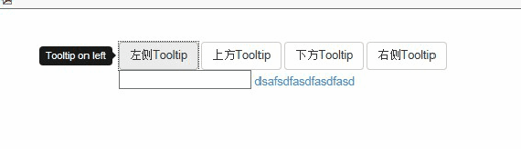 <div class="container" style="margin-top:40px;"> <div class="bs-example tooltip-demo"> <div class="bs-example-tooltips"> <button type="button" class="btn btn-default" data-toggle="tooltip" data-placement="left" title="Tooltip on left">左侧Tooltip</button> <button type="button" class="btn btn-default" data-toggle="tooltip" data-placement="top" title="Tooltip on top">上方Tooltip</button> <button type="button" class="btn btn-default" data-toggle="tooltip" data-placement="bottom" title="Tooltip on bottom">下方Tooltip</button> <button type="button" class="btn btn-default" data-toggle="tooltip" data-placement="right" title="Tooltip on right">右侧Tooltip</button> </div> </div> <input type="text" id="testt" rel="tooltip" title="123456" /> <a href="#" data-toggle="tooltip" title="Default tooltip" >dsafsdfasdfasdfasd</a> </div>