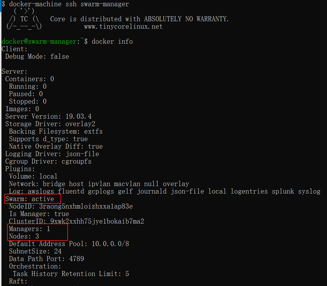 $ docker-machine ssh swarm-manager $ docker swarm init --advertise-addr 192.168.99.107 #这里的 IP 为创建机器时分配的 ip。