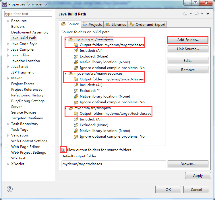 (2)接着在Source里会发现已经有三个目录了,所以点击Add Folder... 添加缺少的目录(这里注意把Allow output folders for source folders 上,方便下一步进行输出路径的设置)