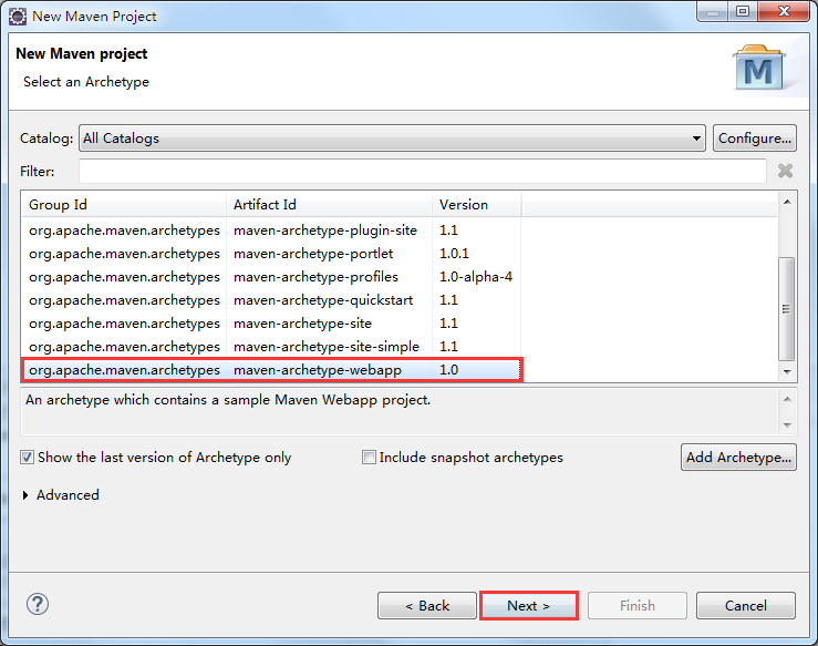3、选中 maven-archetype-webapp 后点击下一步