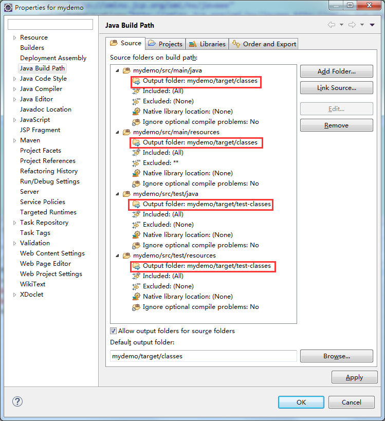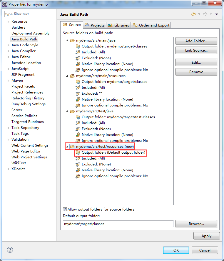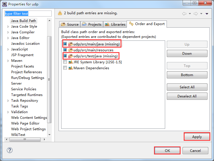 (1)在Order and Export (这里是控制项目中包的显示顺序的)这个栏里会发现有几个目录显示missing(丢失),随便选中一个改变下顺序(Up 或者 Down 或者 Top 或者 Bottom),然后点击应用,OK,丢失的目录会在项目中显示出来,再次进到这个地方,红叉标识已经消失了。(这一步比较奇怪,可能是eclipse中maven插件的bug吧)