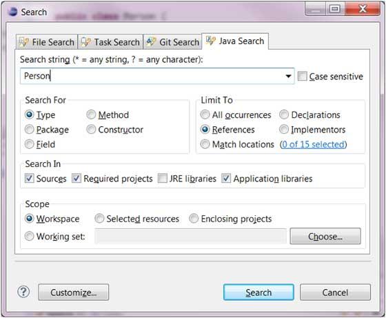 - 在 Search 菜单上选择 Search 或 File 或 Java