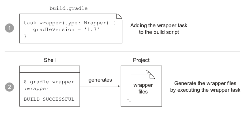 记住你只需要运行gradle wrapper一次,以后你就能用wrapper来执行你的任务,下载下来的wrapper文件会被添加到版本控制系统中。如果你的系统中已经安装了Gradle运行时,你就不需要再添加一个gradle wrapper任务,你可以直接运行gradle wrapper任务,这个任务会使用你的Gradle当前版本来生成包装文件。