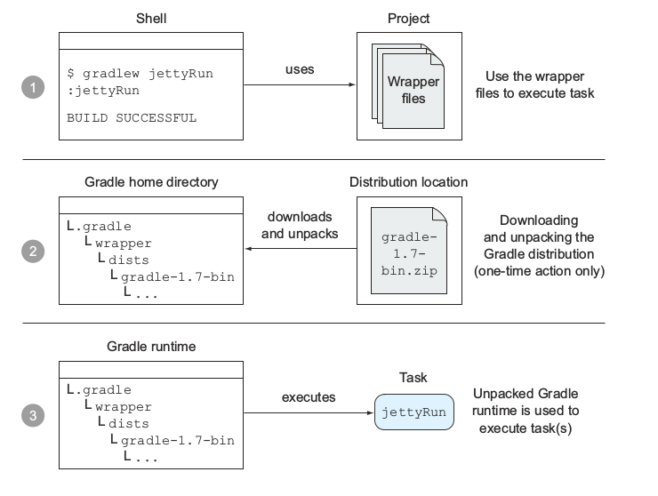 对于这个问题Gradle提供了一个非常方便和实用的方法:Gradle包装器,包装器是Gradle的一个核心特性,它允许你的机器不需要安装运行时就能运行Gradle脚本,而且她还能确保build脚本运行在指定版本的Gradle。它会从中央仓库中自动下载Gradle运行时,解压到你的文件系统,然后用来build。终极目标就是创建可靠的、可复用的、与操作系统、系统配置或Gradle版本无关的构建。