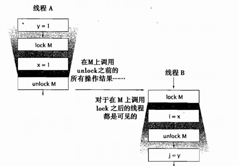 当线程 A 执行某个同步代码块时,线程 B 随后进入由同一个锁保护的同步代码块,这种情况下可以保证,当锁被释放前,A 看到的所有变量值(锁释放前,A 看到的变量包括 y 和 x)在 B 获得同一个锁后同样可以由 B 看到。换句话说,当线程 B 执行由锁保护的同步代码块时,可以看到线程 A 之前在同一个锁保护的同步代码块中的所有操作结果。如果在线程 A unlock M 之后,线程 B 才进入 lock M,那么线程 B 都可以看到线程 A unlock M 之前的操作,可以得到 i=1,j=1。如果在线程 B unlock M 之后,线程 A 才进入 lock M,那么线程 B 就不一定能看到线程 A 中的操作,因此 j 的值就不一定是 1。