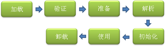 类从被加载到虚拟机内存中开始,到卸载出内存为止,它的整个生命周期包括:加载、验证、准备、解析、初始化、使用和卸载七个阶段。它们开始的顺序如下图所示: