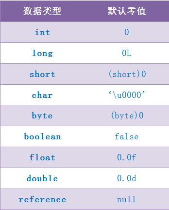 下表列出了 Java 中所有基本数据类型以及 reference 类型的默认零值: