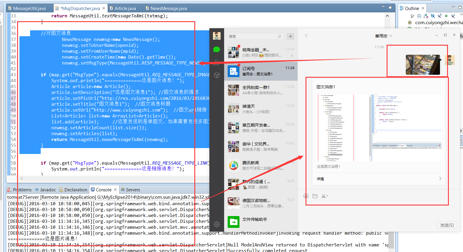 图文消息的回复和文本消息的实现模式是一样的,只不过对应消息体的字段有所区别而已,这里为了和文本消息能有所区分我在【图片消息】实现图文消息的回复,修改 MsgDispatcher: