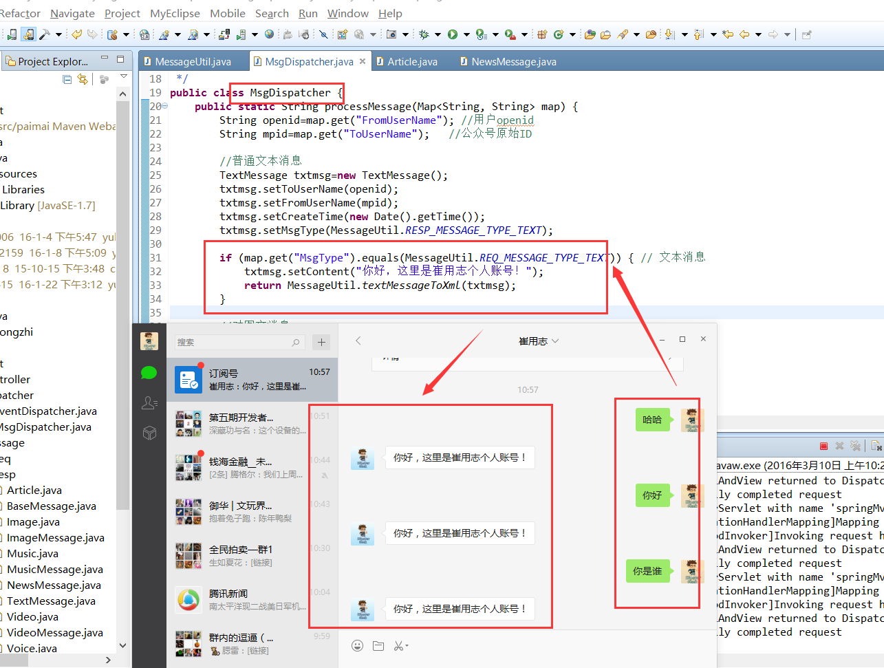 我们回复文本消息的简单实现:修改 MsgDispatcher,在消息分类为【文本消息】中加入如下代码: