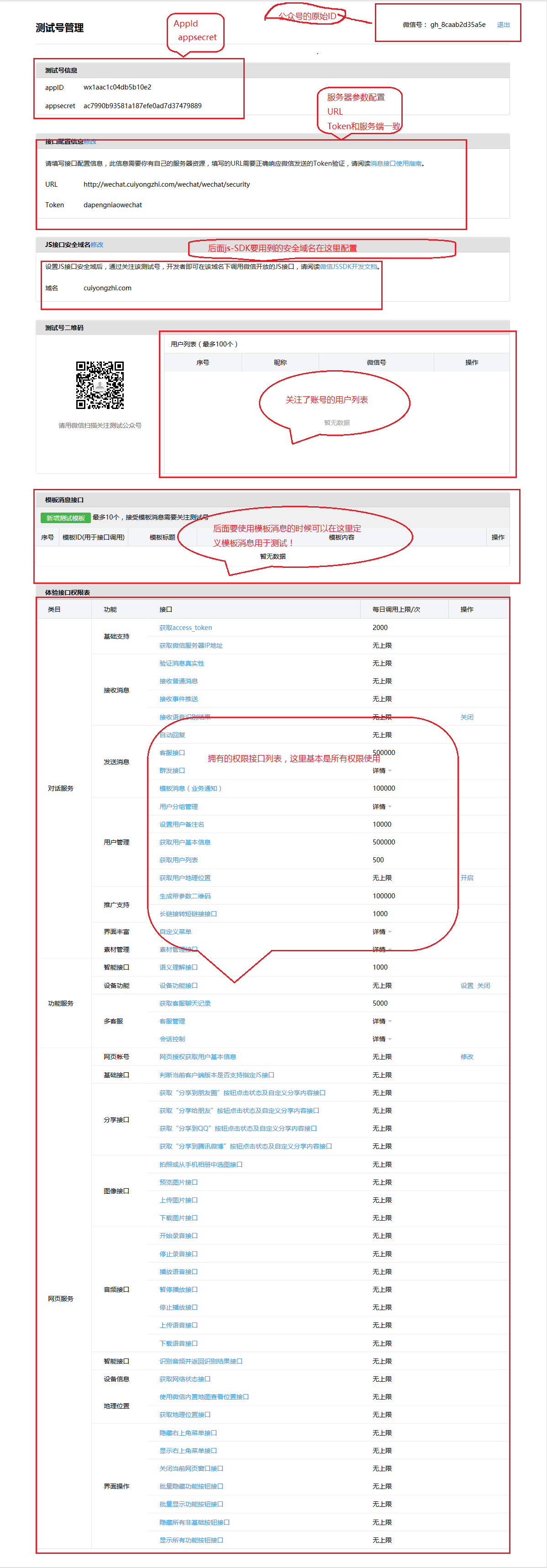 首次进入可能会需要微信扫描登录,登入之后我们就会发现我们拥有一个 100%接口权限的测试账号了,在这里我们就能无限使用我们的测试接口了,下面简单介绍下测试账号的基本配置,为了方便我就直接在截图上备注了,如下图: