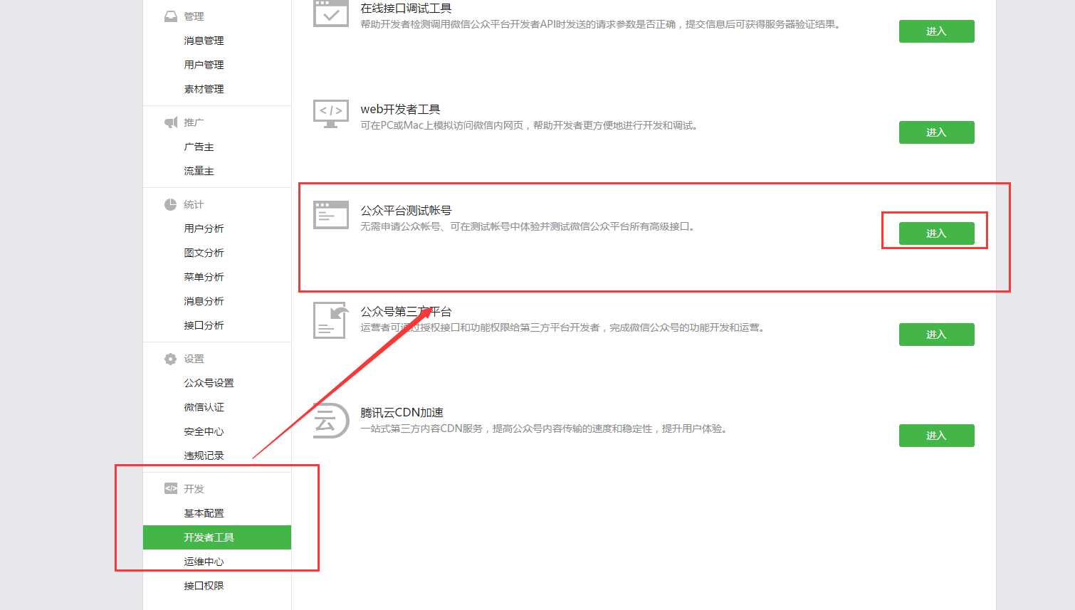 1.登入到微信公众平台,我们到【开发】——>【开发者工具】——>【公众平台测试账号】——进入:\