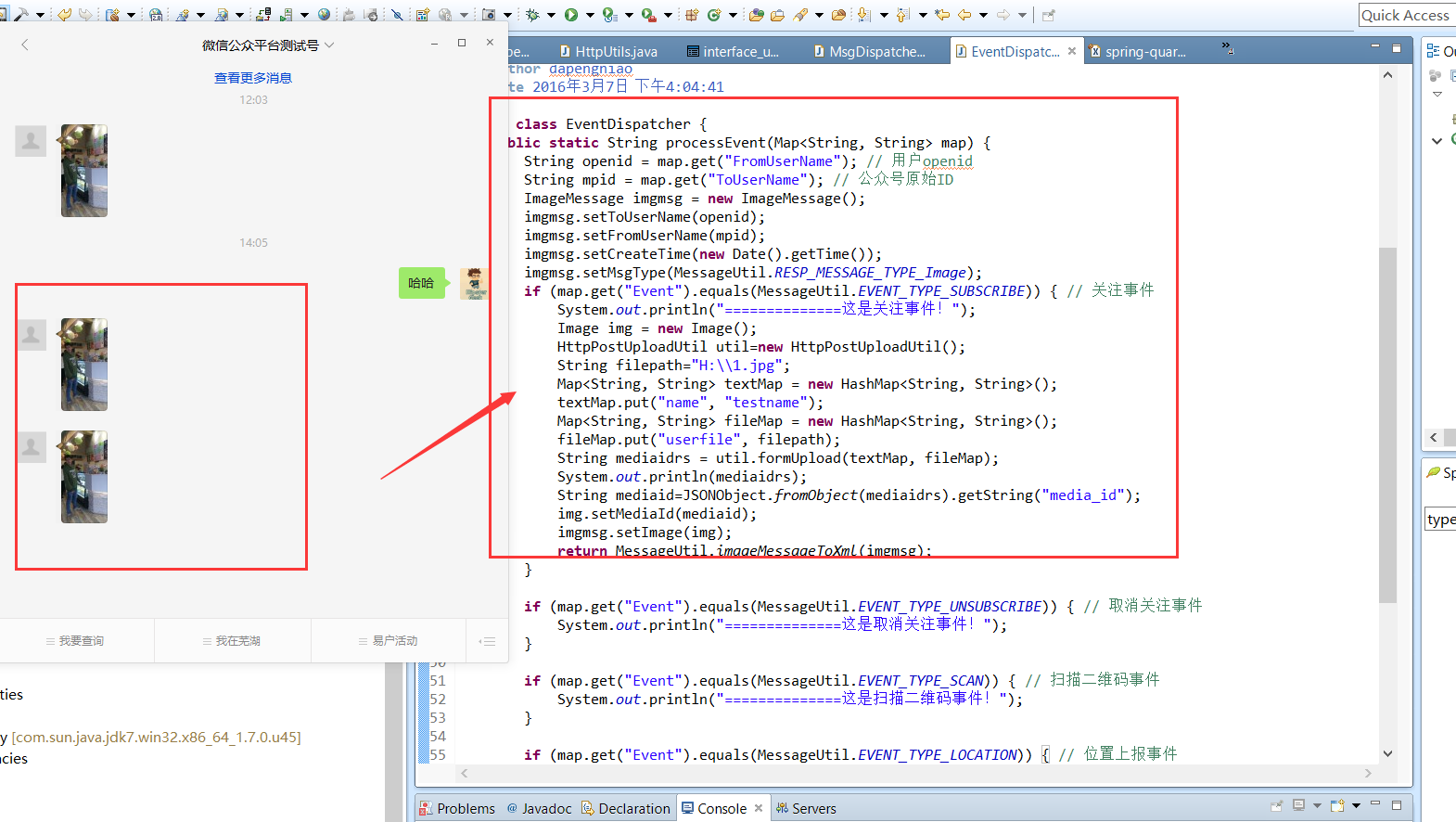 我们将工具类写好之后就需要在我们消息回复中加入对应的响应代码,这里为了测试我将响应代码加在【关注事件】中!