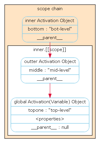 事实上,函数的属性”[[scope]]”会在函数对象创建的时候被创建,这个特性在下一小节中讨论,而不论函数的嵌套层次有多深,它的”[[scope]]”总会引用所有的位于其外层的上下文中的变量对象(在函数中,为活动对象)。