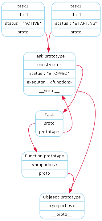 由于Task本身仍旧是函数,因此其”proto”属性为Function.prototype, 而内建的函数原型对象的”proto”属性则为Object.prototype对象。最后Obejct.prototype的”proto”值为null.