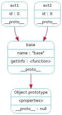 可以看到,当执行 ext1.id 时,引擎在 ext1 对象本身中就找到了 id 属性,因此返回其值 0,当执行ext1.getInfo时,ext1 对象中没有找到,因此在其原型对象 base 中查找,找到之后,执行这个函数,得到输出”base”。