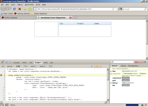 通过使用FireBug,我们就可以丢弃alert方式的调试了,FireBug的调试与其他的IDE的使用非常类似,通过在代码左侧的行号旁边单击打断点,然后刷新页面进入调试环境,可以单步执行,直接返回等。右侧的面板上包含watch,栈情况,以及关于所有断点的信息,调试起来非常方便。