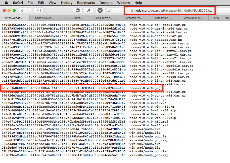此示例来自 nodejs.org 网站的 node-v10.4.0.pkg 文件。复制校验和(上面文件名左侧的长字符串)并将其粘贴到编辑器中(为此,我将 TextEdit 保留在 Dock 中)。