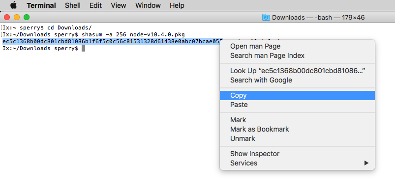 现在,打开一个终端窗口并浏览至下载目录(或下载文件的任何位置),并在下载的文件上运行 shasum 命令: